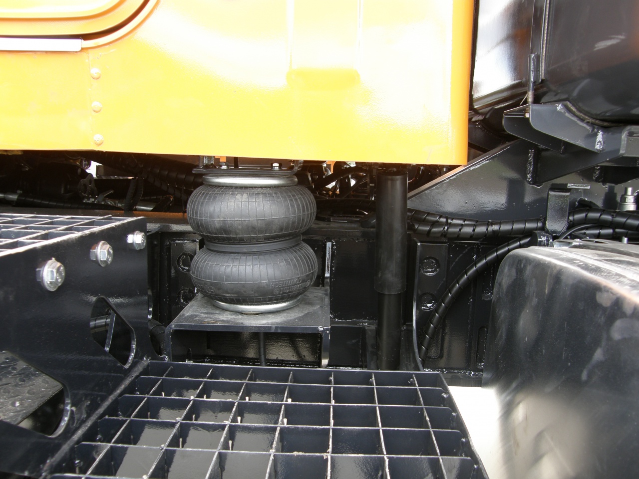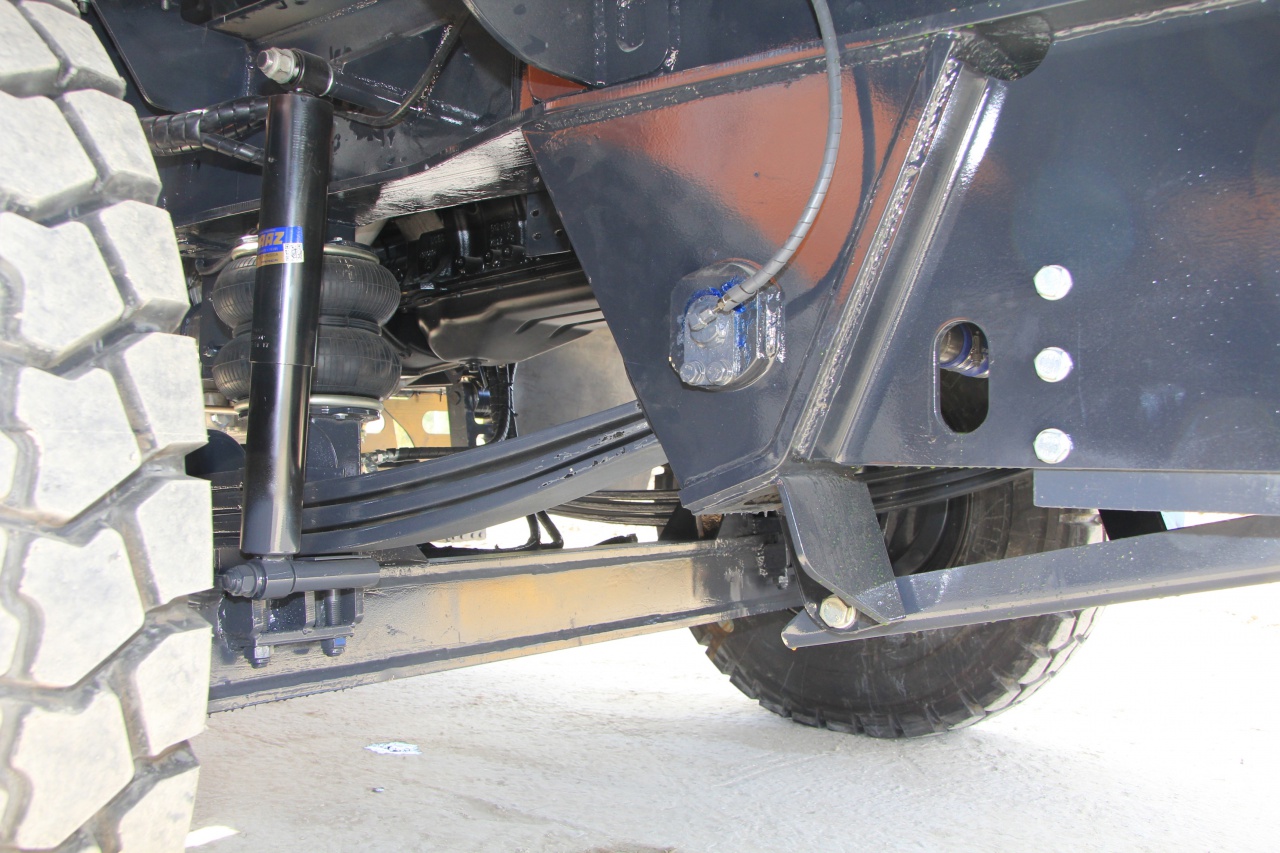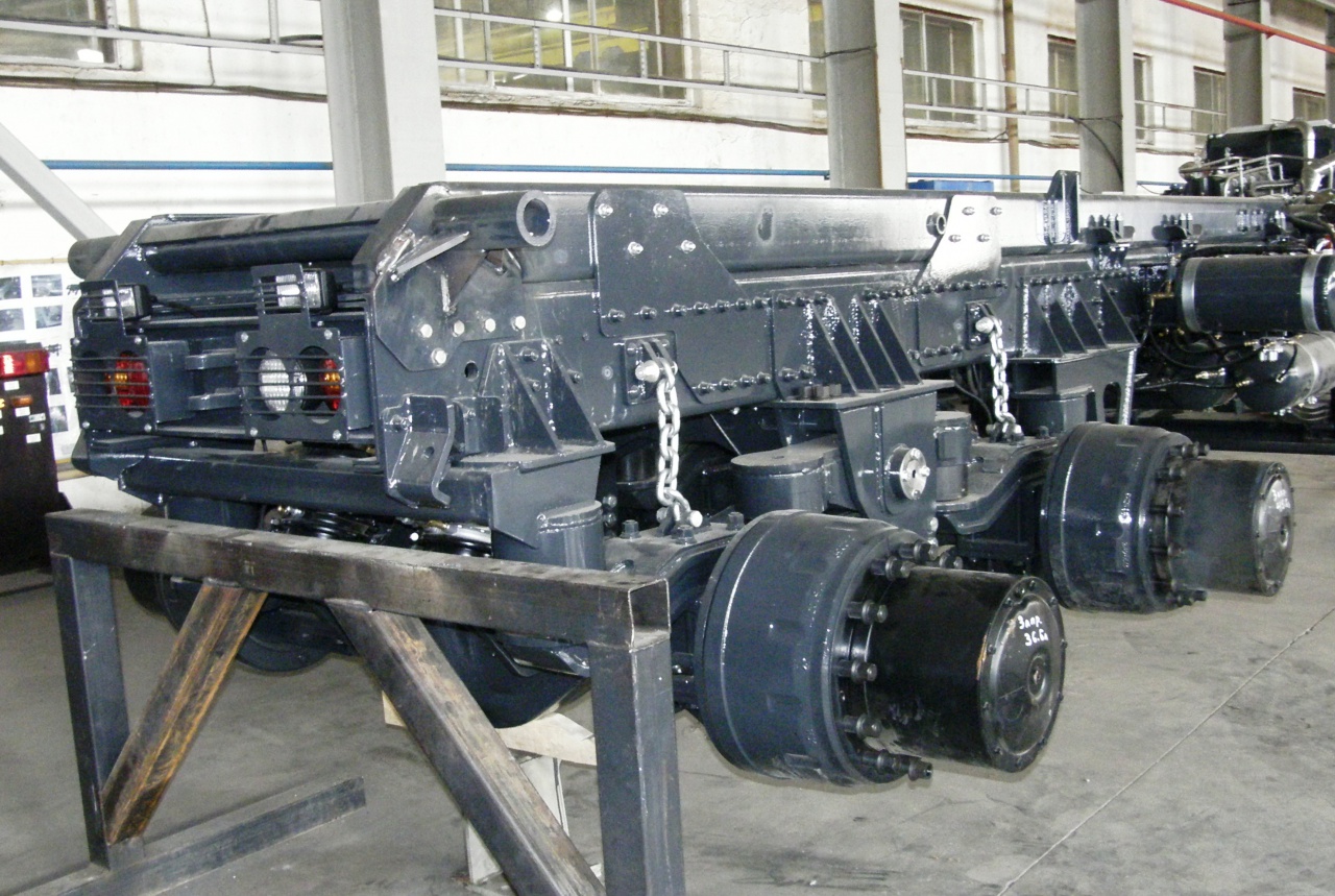 Подробно изучив зарубежную практику, заднюю балансирную подвеску оборудовали резиновыми упругими элементами вместо традиционных многолистовых рессор. Вертикальная нагрузка на каждый ведущий мост передается с помощью четырех упругих элементов, а продольные и боковые нагрузки воспринимаются реактивными тягами с резинометаллическими шарнирами. Тормозная система Wabco с АБС поступает из Германии. Колеса грузовиков «обули» в выносливые радиальные шины 14.00 R25 B03S (E4, E3) родом из Поднебесной. По заказу появится система управления давлением воздуха в шинах TireBoss. Для более надежной защиты элементов ходовой части штатно установлена 24-точечная система централизованной смазки Lincoln Quicklubе.