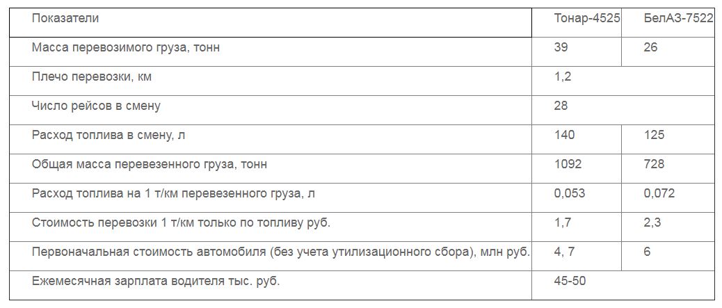 Результаты эксплуатационных испытаний Тонар-4525 и двух БелАЗ-7522: