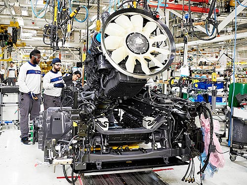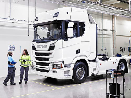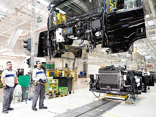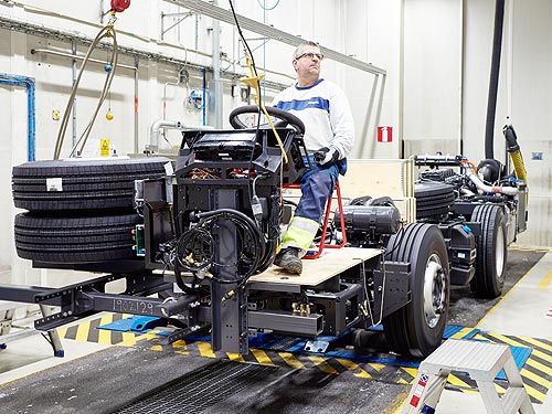 Интересно решен на Scania процесс установки нестандартных решений на серийные грузовики. К примеру, идет по конвейеру грузовик с дополнительной задней поворотной осью. Так вот его собирают параллельно две бригады: все, что стандартно устанавливают обычные сборщики, а дополнительную ось монтируют рабочие в синей униформе. На следующем посту опционные детали также монтируют дополнительные люди. Такой подход позволяет вписываться в заявленный такт конвейера и выпускать сложнейшие исполнения на основном конвейере.