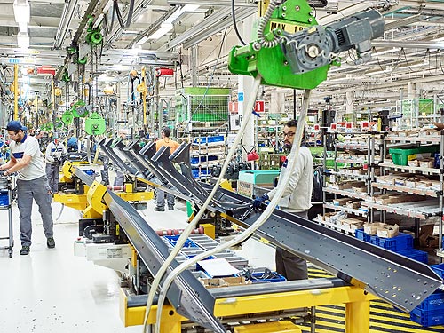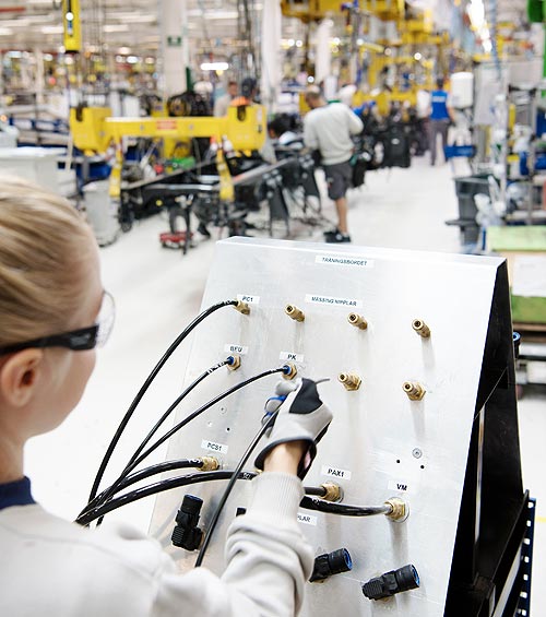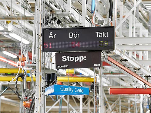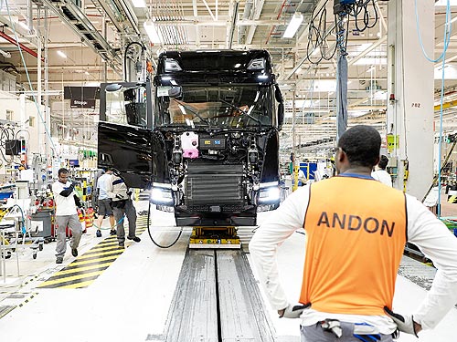 Как нам рассказали на предприятии, Scania заимствовала конвейерную систему контроля качества Toyota, но немного ее модернизировала. Здесь вдоль конвейера также тянется шнур – «андон», с помощью которого можно остановить весь конвейер, если обнаруживается на каком-либо участке отклонение. В этом случае штатной бригаде придут на помощь коллеги.