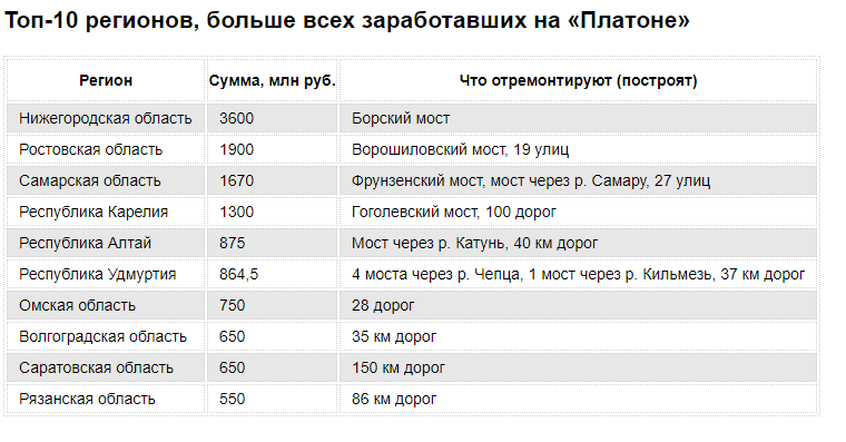 Так, в 2018 году с использованием средств от госсистемы «Платон» построили и восстановили мосты: через Волгу в подмосковной Дубне, через Терек в Чечне, через реку Сосна в Орловской области, Белореченский мост в Краснодарском крае и мост через реку Чепца в Глазове. В начале 2019 года открылся еще один мост в Удмуртии, в течение года будут открыты два моста в Орловской области и Фрунзенский мост в Самаре. Из этих же собранных миллиардов ведется ремонт федеральной трассы Р-243 от Костромы до Перми.