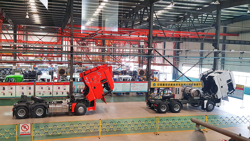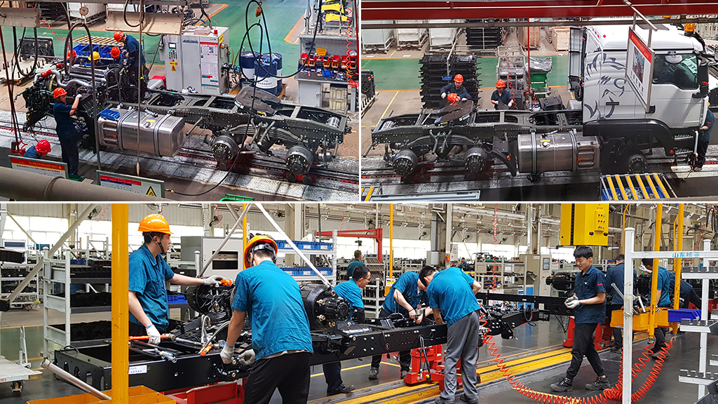 Нам удалось понаблюдать за процессом сборки седельных тягачей Sitrak C7H от начала и до конца. Каким же образом здесь налажен производственный процесс? Итак, по линии медленно двигается почти готовая рама, на которую специалисты устанавливают элементы конструкции: гидравлику, проводку, баки, кабину и т.д. На полную сборку одной машины отводится 3 часа.