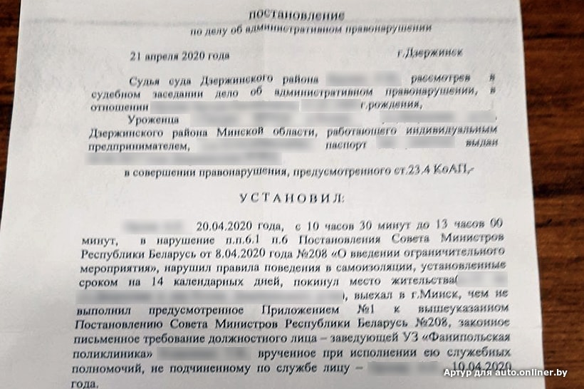 Суд установил, что водитель 20 апреля с 10:30 до 13:00 нарушил правила поведения в самоизоляции, установленные сроком на 14 дней, покинул место жительства, выехал в Минск. При подготовке дела об административном правонарушении вину признал.