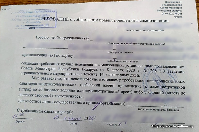 — Там и написано-то два слова: разъясняется, что в течение 14 дней я обязан находиться на самоизоляции, в противном случае штраф в размере до 50 базовых величин или даже уголовная ответственность. По-простому мне на словах объяснили, что в магазин или аптеку сходить можно, но только в маске, в перчатках. И на этом все — никаких прочих перемещений. Бумагу дали и отправили — поезжай.