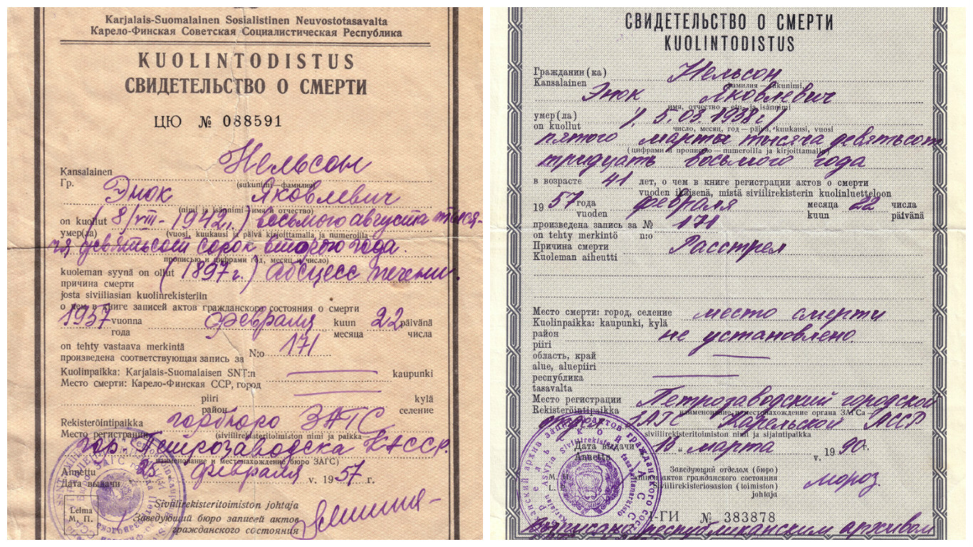 В ту ночь своего любимого отца дети видели в последний раз. В 1957 году семье выдали лживое свидетельство о смерти, в котором были искажены дата смерти и ее причина. В подлинном свидетельстве о смерти, выданном в 1990 году, значилось: "Причина смерти - расстрел". Расстреляли его в Сандормохе.