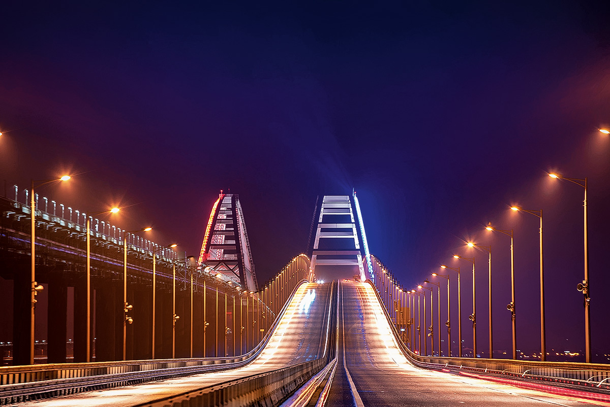 Крымский мост через Керченский пролив по световому решению тоже попал в рейтинг красивейших транспортных объектов с удачной интегрированной в наземно-морскую среду магистральной и декоративной подсветкой. На автомобильной части сооружения установлено 1092 мачты освещения, из них 14 стоят непосредственно в зоне арки. На железнодорожной части — 2479, из них 36 — на арке.
