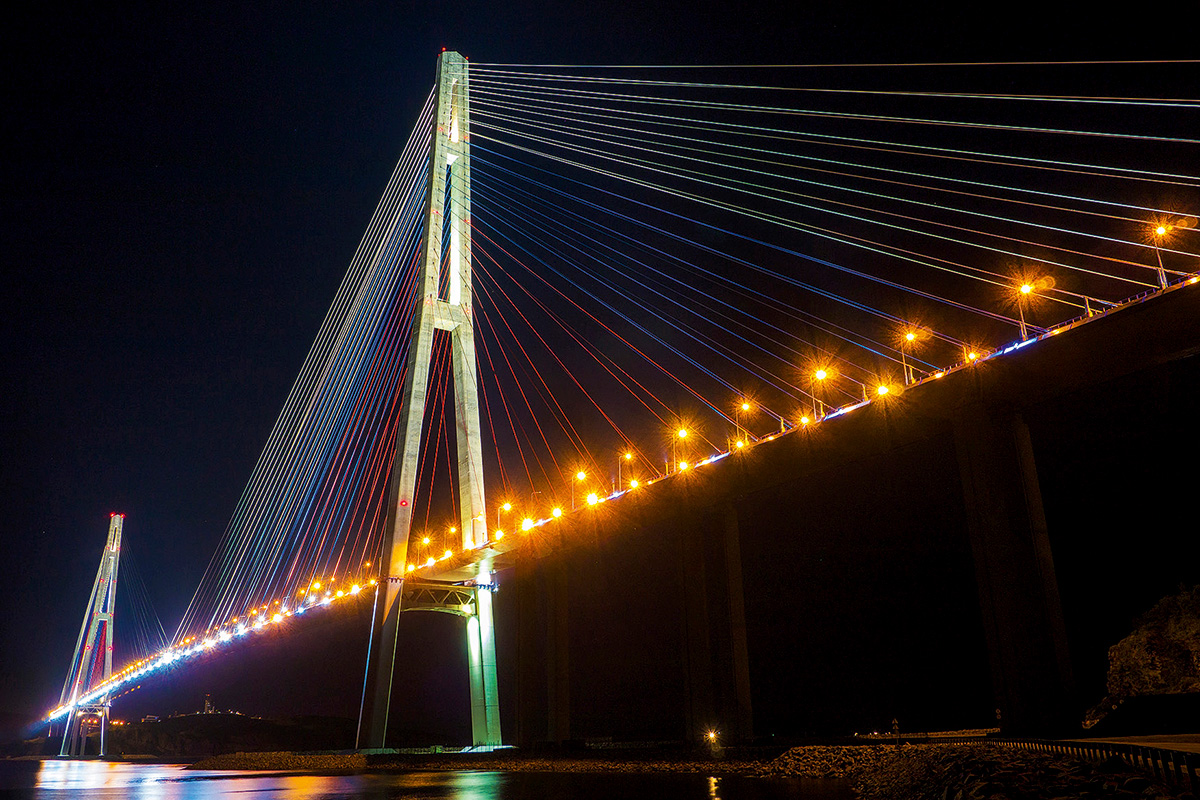 Самой красивой системой освещения в России славится мост через пролив Босфор на остров Русский во Владивостоке. Его вантовые канаты в темное время суток расцвечены российским триколором. Проезжая часть получила оптимальный по яркости и цвету световой поток, который не слепит водителей наземного транспорта и рулевых морских судов. Световая среда создавалась с учетом сложных климатических условий, сейсмической активности, перепадов температуры и других факторов. Там используются светодиодные светильники специализированной серии IntiLINE marine компании IntiLED.