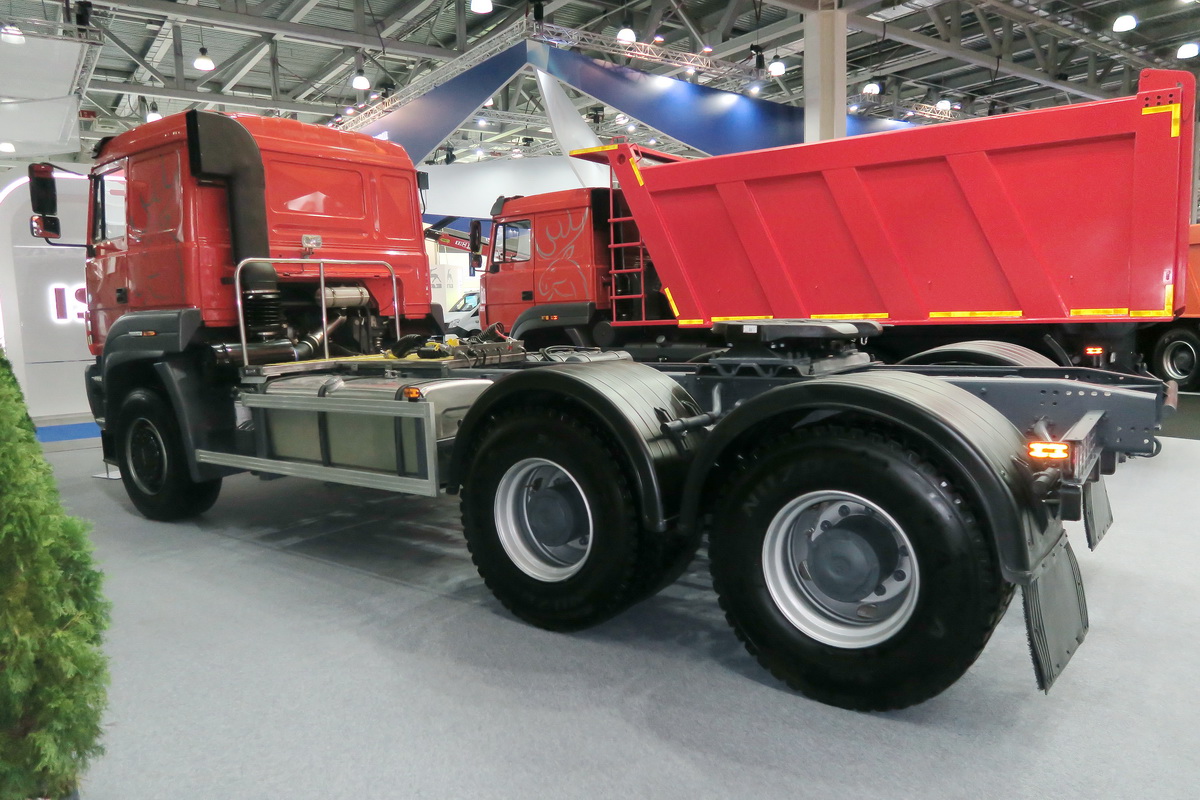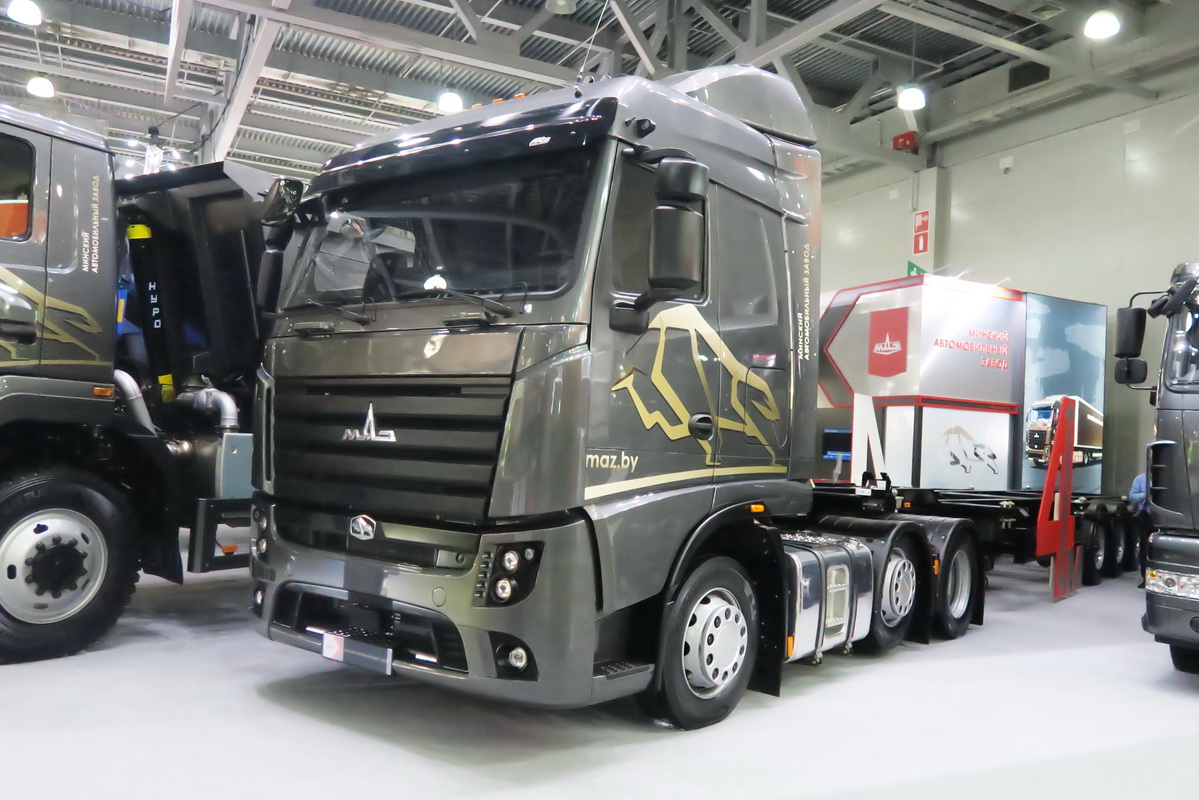 МАЗ показал версию своего «евротягача» с мерседесовским мотором Евро-6 в варианте 6х2 с «бельгийкой»-пушером. Такой вариант в его программе появился впервые. Впрочем, в России этих тягачей до сих пор не продано ни одного: ради пяти тысяч евро экономии мало кто выберет МАЗ вместо европейского аналога.