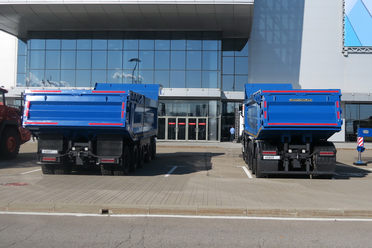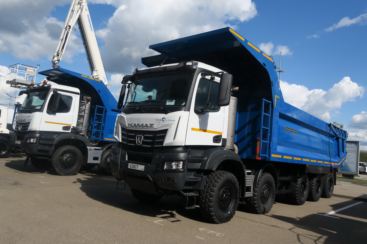 Среди многочисленных экспонатов нового поколения выделялись рекордсмены строительной отрасли, встретить которые на дорогах вряд ли удастся. Это два пятиосных самосвала-карьерника с огромными кузовами. Грузоподъемность дорожного К8550 достигает 60 тонн, а внедорожного монстра шириной 3,5 метра — 65 тонн. Оба оснащаются короткой кабиной, собственным рядным дизелем КАМАЗ-910 мощностью 550 л.с. и гидроавтоматической коробкой передач Allison 4700.