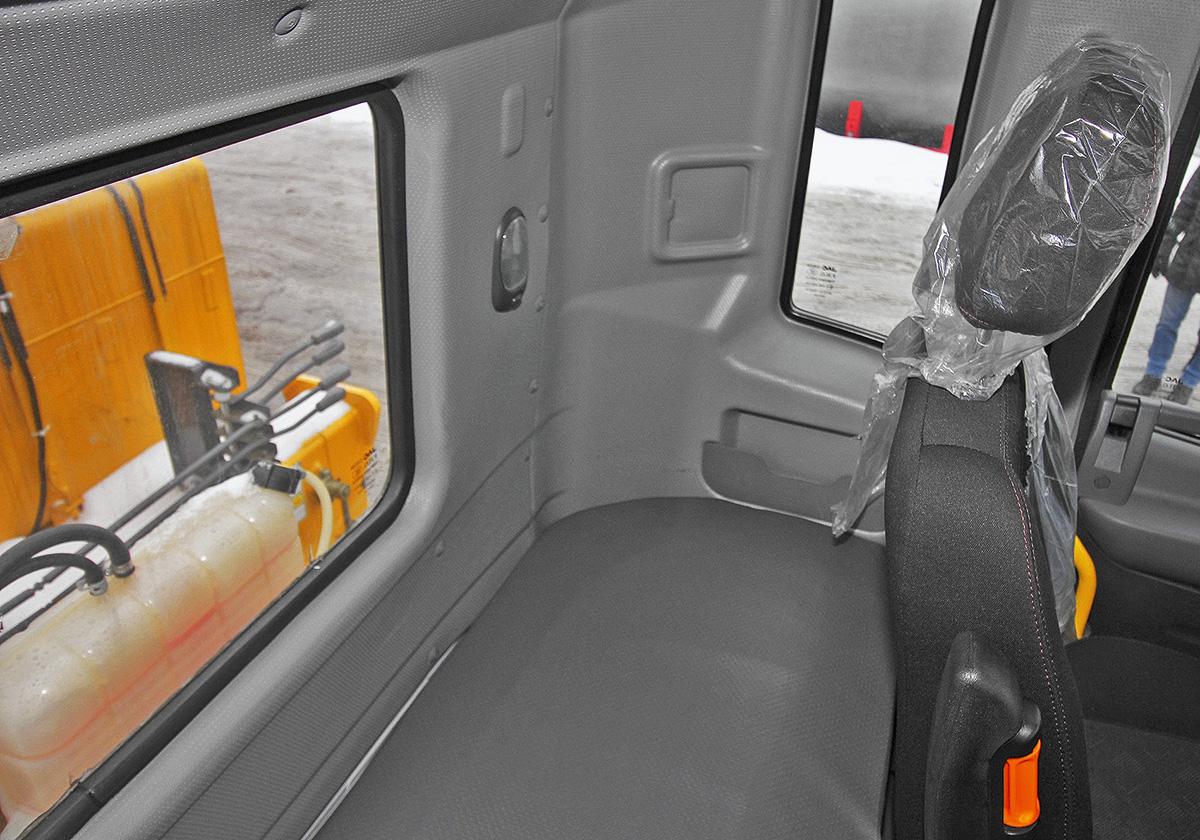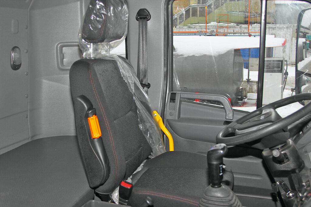Водительское кресло не такое удобное, как на магистральных тягачах, но и не столь бюджетное, как на ряде грузовиков азиатского производства. Оно подрессоренное, с подлокотником, регулируемым по высоте подголовником и ремнем безопасности.