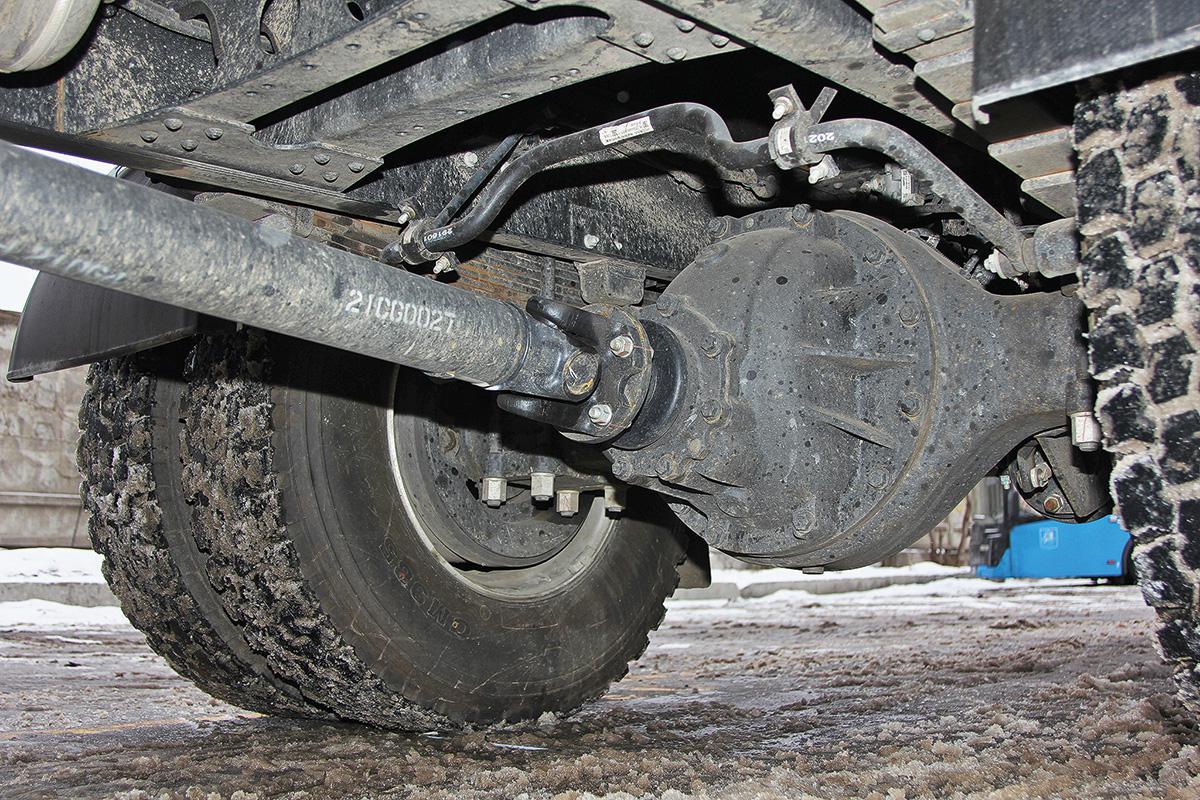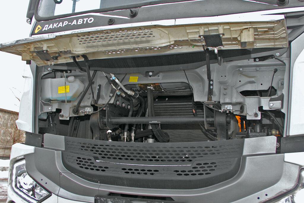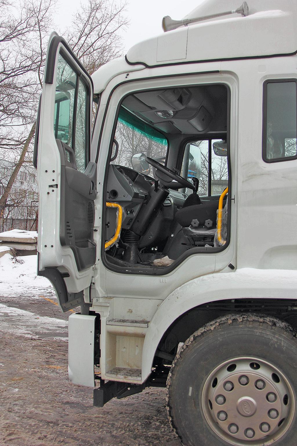 Вход в кабину удобен. Дверь открывается на большой угол, а рифленые алюминиевые подножки не накапливают грязь и снег. Устроиться на рабочем месте водителя можно буквально за несколько секунд. Руль регулируется по углу наклона и вылету, благодаря чему можно опытным путем определить оптимальные для себя установки. Рулевой механизм типа «винт — шариковая гайка — рейка» снабжен гидроусилителем, что облегчает маневрирование на небольших скоростях. Правда, угол поворота колес не так велик, как, например, у «немцев». В совокупности с длинной колесной базой и внушительным задним свесом это накладывает отпечаток на поведение водителя и заставляет быть настороже при маневрировании на парковке, во дворах, на складах и в других местах с ограниченным пространством.
