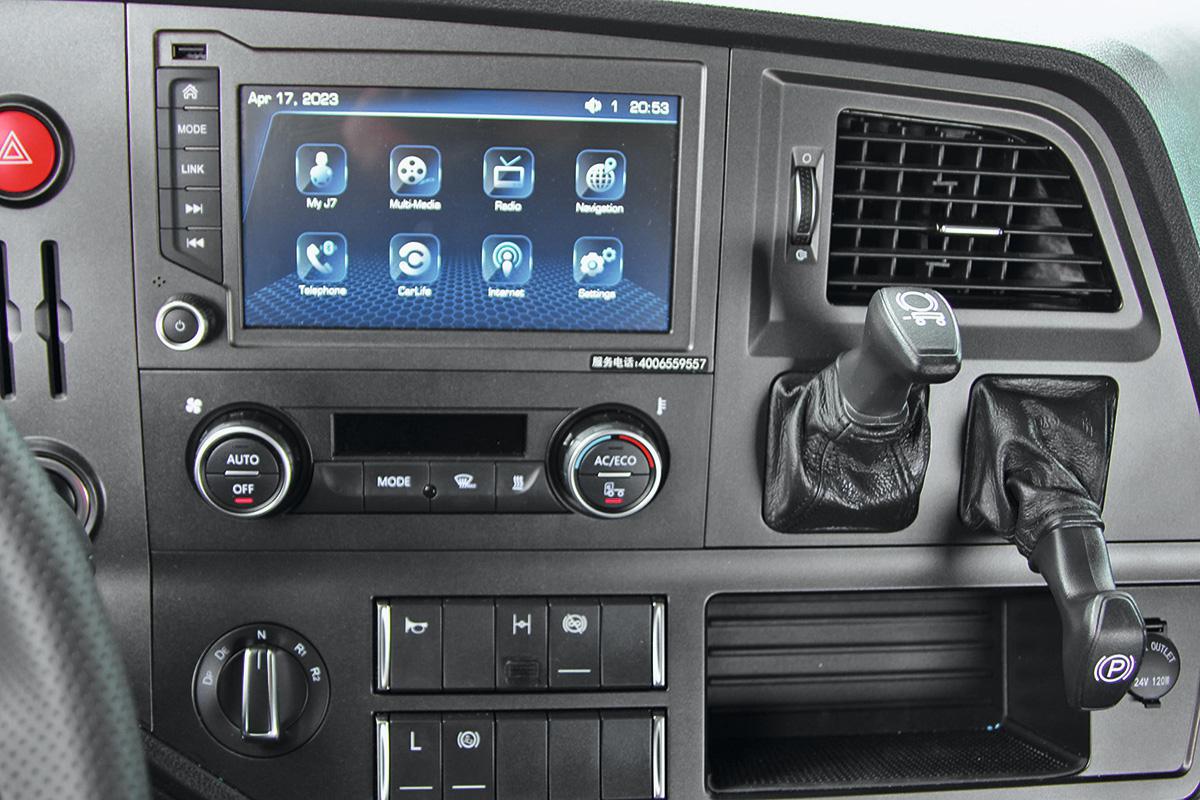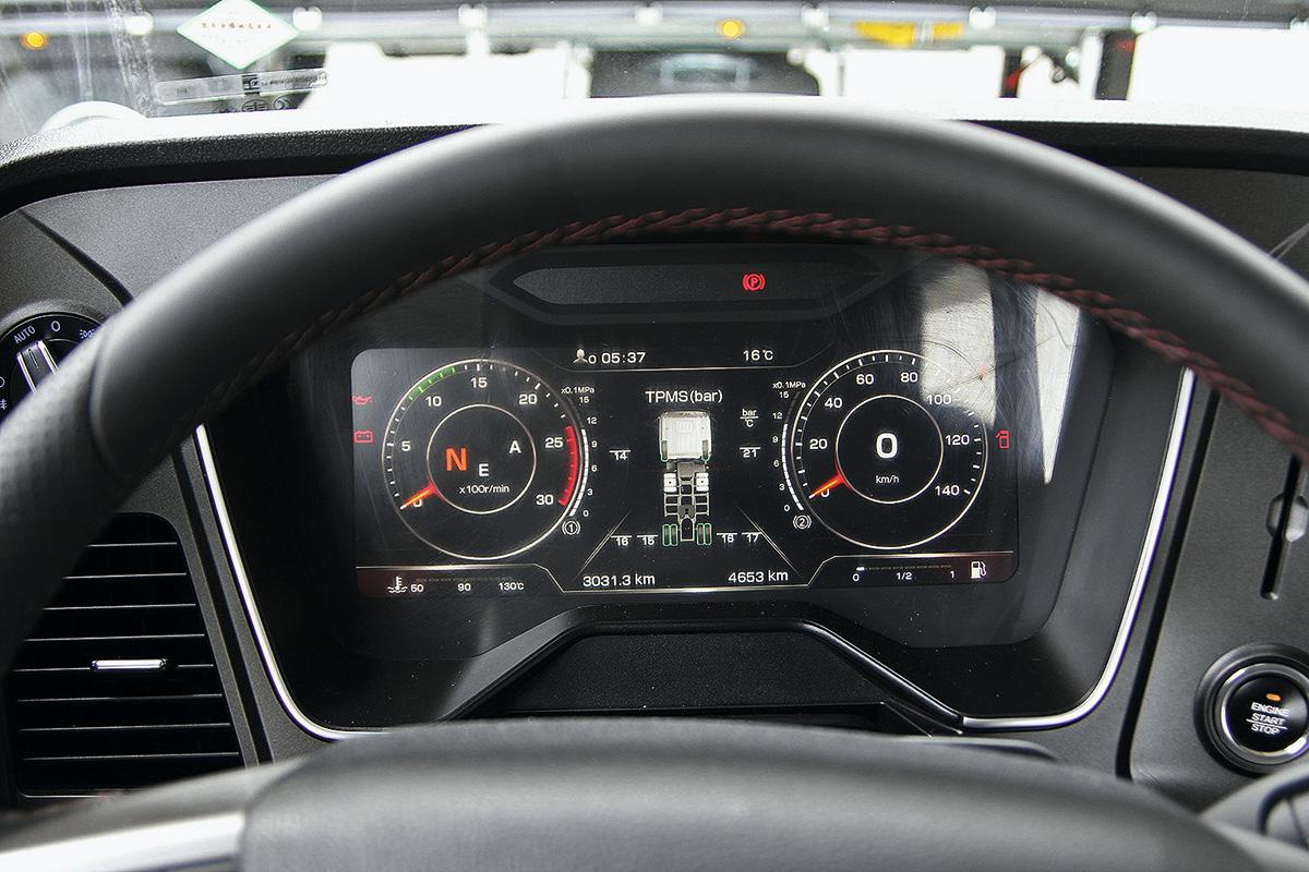 Тормозная система тягача от WABCO и Knorr-Bremse, тормоза дисковые на всех колесах. Автомобиль оснащен современными электронными помощниками, повышающими безопасность, — системами устойчивости, контроля движения в полосе, предупреждения о лобовом столкновении и др. Для водителя сделано не просто кресло, а, по нынешним меркам, настоящий дальнобойный «трон» на пневмоподвеске с поясничным упором, функциями вентиляции и подогрева. Рулевое колесо отделано кожей и имеет регулировки по высоте и наклону, как у европейских тягачей.
