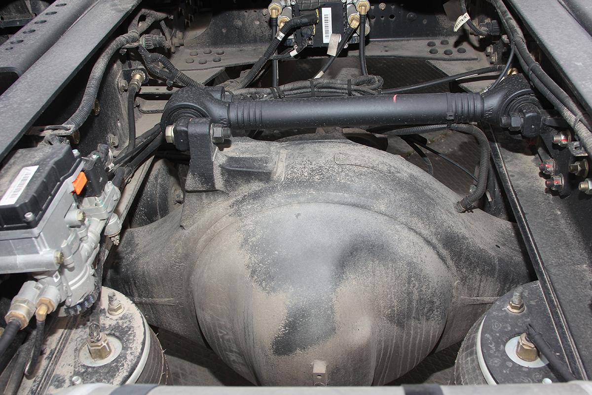Подвеска классическая: спереди малолистовые рессоры, сзади — на пневмобаллонах. Максимальная нагрузка на переднюю ось 7,5 тонны, на задний мост — 13 тонн. Особо отмечу, что задняя подвеска двух-, а не четырехбаллонная. В качестве направляющего устройства используются два продольных рычага с задней поперечиной. В двухбаллонной подвеске меньше компонентов, а значит, будет проще с обслуживанием. К слову, у Scania тоже двухбаллонная подвеска. Высота седла Jost магистральная — 1157 мм, что позволяет использовать широкий спектр прицепного состава.