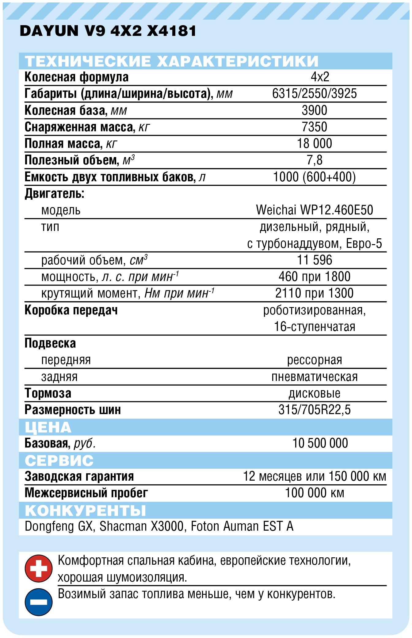 В общем, у Dayun V9 есть все шансы прийтись ко двору и впрячься в грузоперевозки по России, что называется, по полной программе. И главное: в условиях дефицита подвижного состава спрос на такую технику будет и на вторичном рынке.