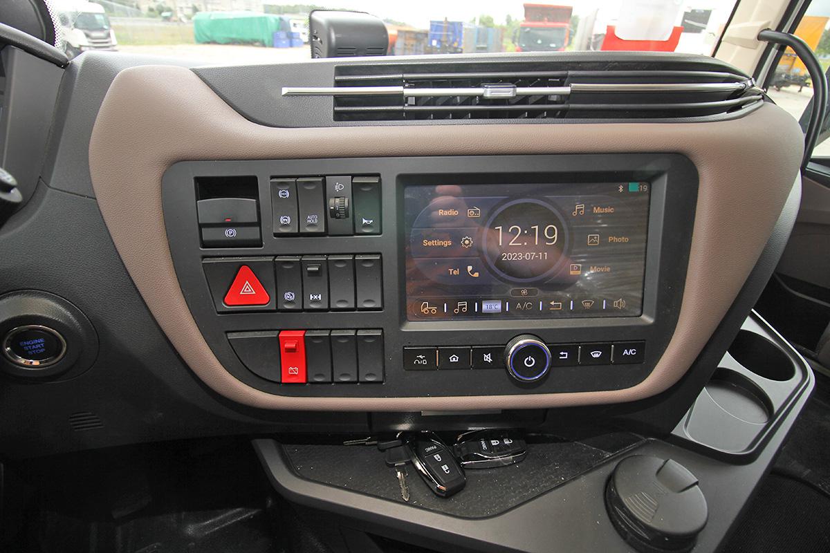 Dayun V9 получил шикарную даже по европейским меркам кабину: на пневматической подвеске, с высокой крышей и ровным полом, с хорошей эргономикой и богатым оснащением. Поставщик включил в комплектацию кнопку старт-стоп, центральный замок, электрические стеклоподъемники, систему климат-контроль, люк в крыше с двумя шторками и электроприводом, датчики света и дождя, светодиодные ходовые огни, контурную подсветку салона, как в дорогой легковушке. Предусмотрен жидкостный подогреватель двигателя и кабины и автономный отопитель.