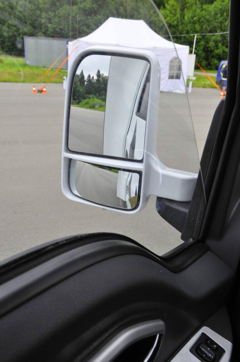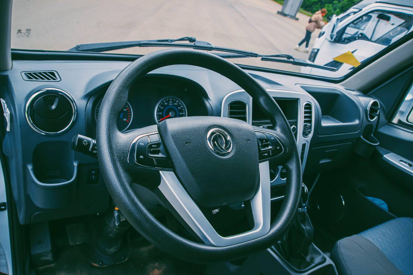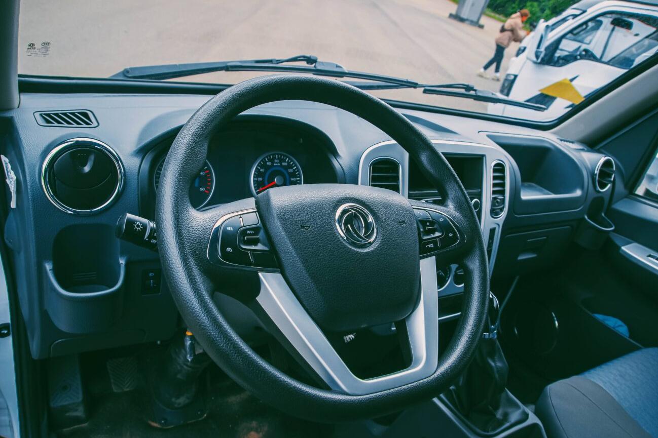 Кабина двухместная, хотя пассажирское сиденье заявлено как полуторное. Для доступа в кабину есть ухватистые ручки на передних стойках. Устроившись за рулем, не следует ждать от салона чудес, здесь все просто, утилитарно, но сделано для того, чтобы водитель не отвлекался от работы (кнопки управления круиз-контролем на руле предлагаю не рассматривать как вершину инженерной мысли). Лишь тонкий по обхвату руль намекнул, что премьера японской машины, которая легла в основу этого китайского грузовика, состоялась очень давно. Вот что решительно не понравилось, так это зеркала заднего вида. Они не адаптированы к надстройке, которая шире кабины, оттого не особо информативны. В них есть сферическая секция, но «картинка» по ним маленькая. Так как машины предназначены для работы в городе, с зеркалами надо будет что-то делать.