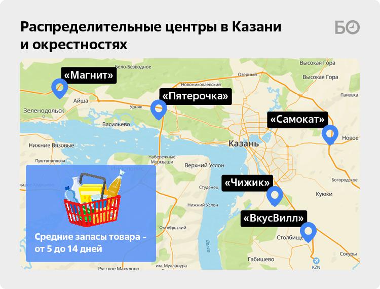 Как же формируют запасы ретейлеры? В пригороде Казани сейчас 6 распределительных центров, где складируют и хранят продовольственные и непродовольственные товары. Больше всего мощностей у X5 Retail Group («Пятерочка», «Перекресток» и «Чижик») — склады находятся в Новой Туре и Усадах. «Магнит» обосновался в Зеленодольском районе, «Верный» — в Приволжском районе Казани. Свой оптовый склад есть также у Metro.