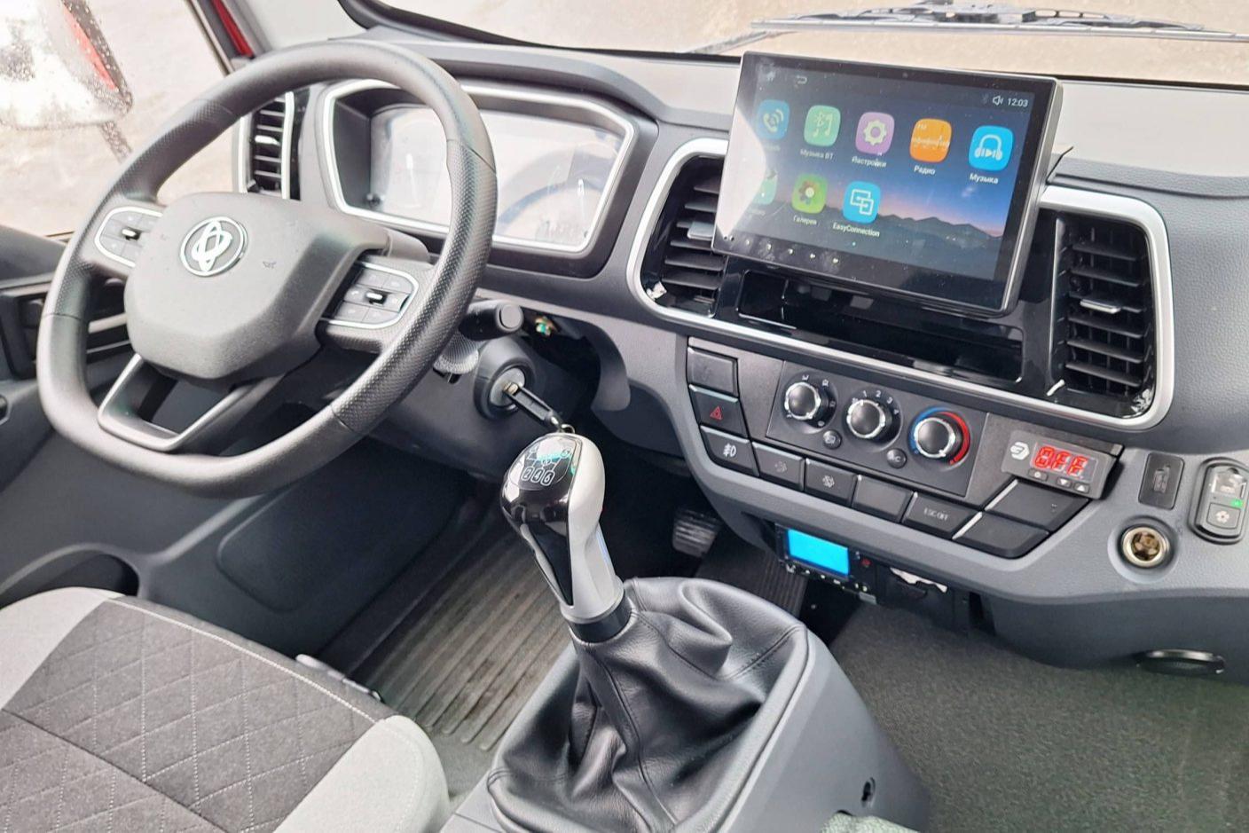 В базовой комплектации правее рулевого колеса расположен большой сенсорный экран, с помощью которого можно управлять системой Bluetooth, мультимедиа и магнитолой. А когда грузовик сдает назад, на этот же дисплей выводится картинка с камеры заднего вида. Вот только я все равно добавил бы сюда парктроники, потому что есть десятки причин, которые могут отвлечь водителя от экрана, а они всегда предупредят о возникновении помехи. На приборном щитке тоже есть свой экран, причем цветной и сравнительно крупный, на который выводится информация об эксплуатационных параметрах и настройках.