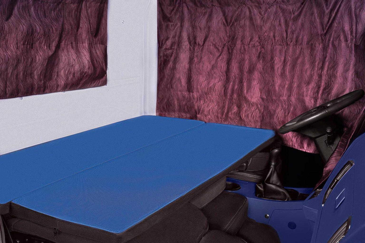 Даже у удлиненных кабин подавляющего большинства среднетоннажников сравнительно небольшие габариты. Поэтому их водители, чтобы удобно расположиться на узкой и короткой спальной полке, как правило, откидывают вперед спинку правого пассажирского сиденья, тем самым увеличивая пространство для ног. А здесь, если то же самое проделать еще и со спинкой левого сиденья, появляется возможность разложить спальную полку, двукратно увеличив ее ширину!