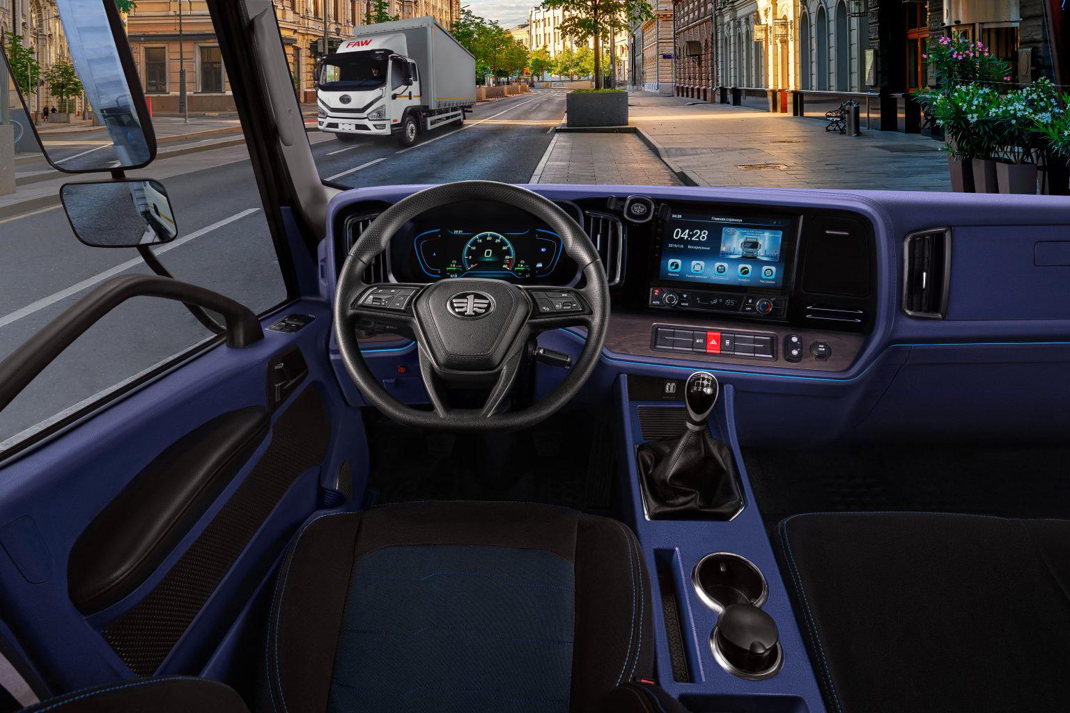 В профиль FAW Tiger 6G похож на все остальные представленные на нашем рынке китайские среднетоннажники. А вот анфас — совсем другое дело! Тут главный стилистический элемент — изогнутая полоска воздухозаборника во всю ширину кабины с вздернутыми кверху хромированными краями, выделяющая этот грузовик среди моделей многочисленных конкурентов. Ближний и дальний свет фар — светодиодный. Но нам все же гораздо интереснее, какова кабина не снаружи, а внутри. Ее интерьер выполнен в несколько непривычном темно-синем цвете и без каких-то цепляющих глаз дизайнерских изысков.