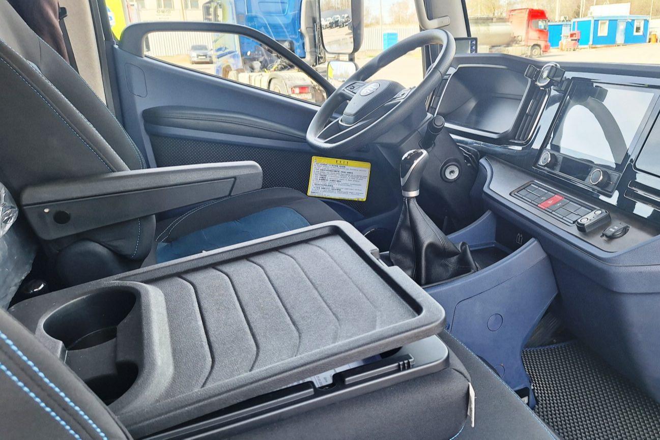 Интересно, что приборный щиток — полностью цифровой, а по правую руку расположен охлаждаемый бокс для напитков (он не только охлаждаемый, но и с подогревом). В кабине имеется розетка на 220 В, рассчитанная на подключение приборов мощностью 1 кВт.