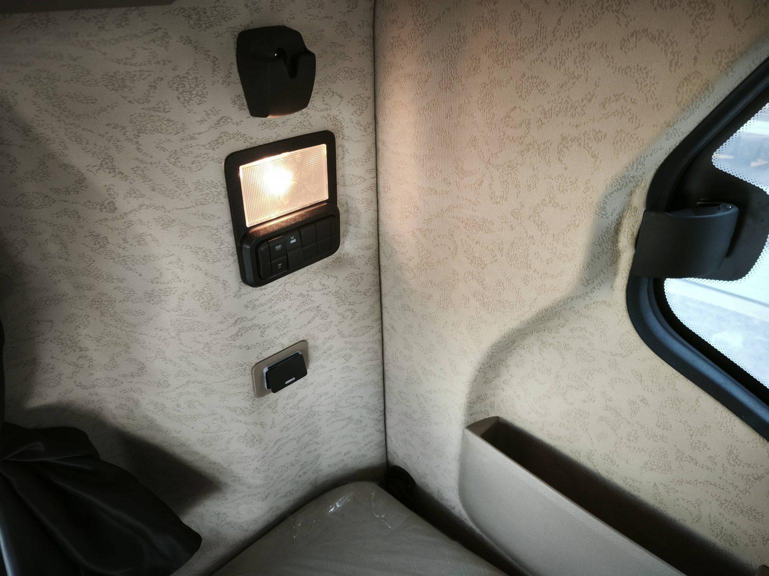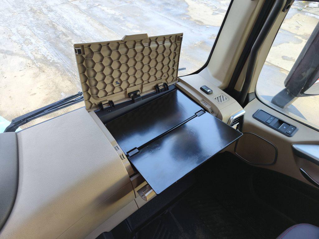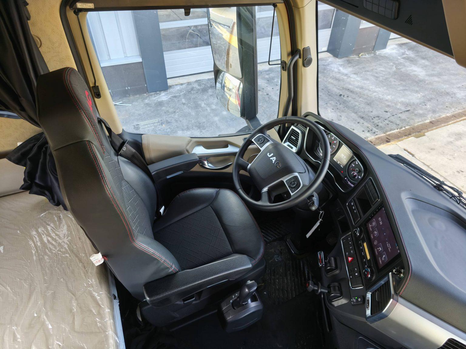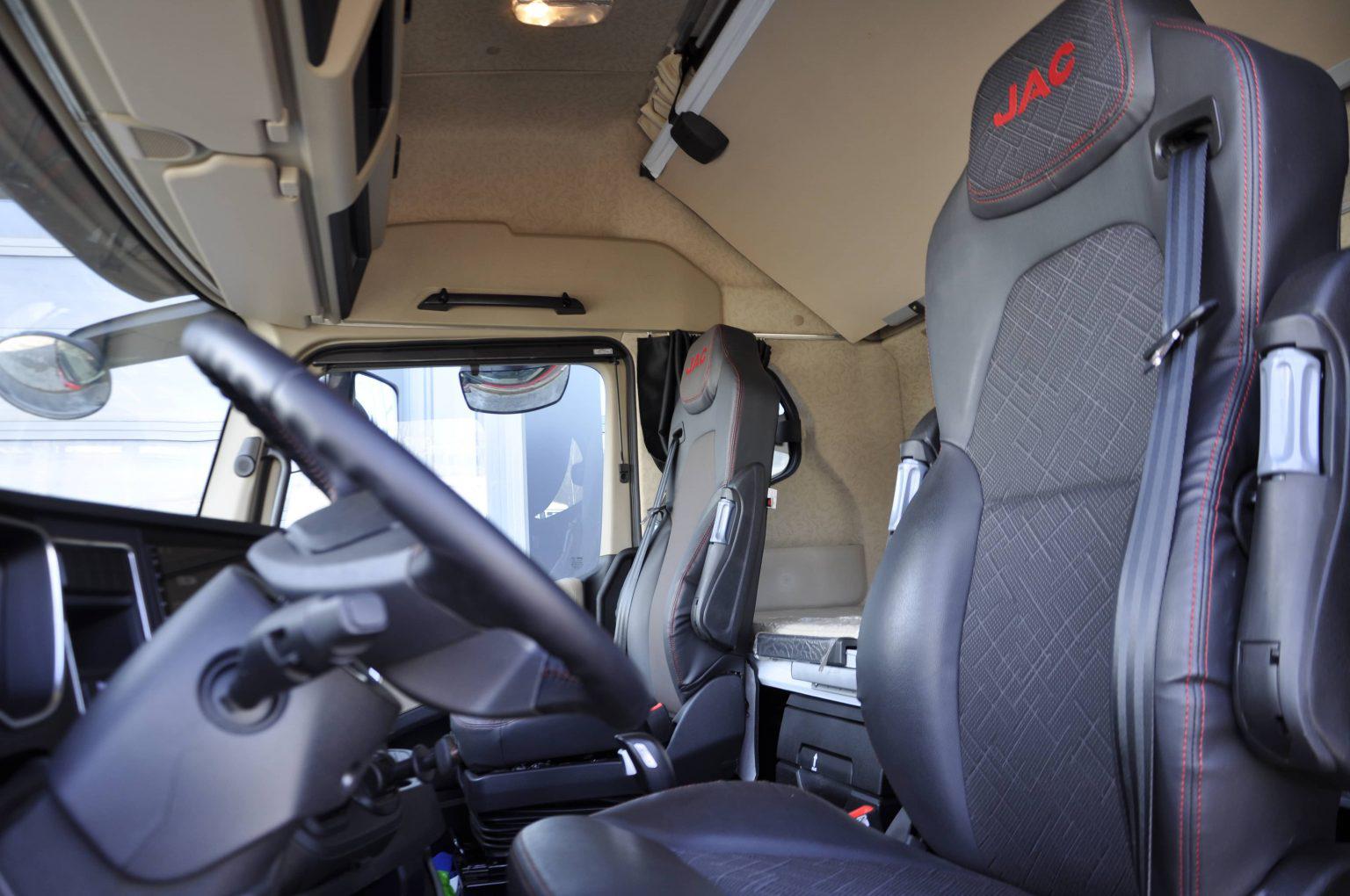 У JAC K7 классическая кабина магистрального тягача: внутренняя высота 2100 мм позволяет встать в полный рост, вместительная, богато укомплектованная, и с хорошим по качеству пластиком, который в движении не скрипит и не гремит. Передняя панель обтянута кожзамом и прошита красной строчкой. Визуально очень красиво, на ощупь тоже приятно. Хромированные элементы дверных карт и дефлекторов кондиционера на центральной консоли органично вписываются в интерьер. Клавиши на приборной панели расположены в соответствии с частотой их использования и важностью, характеризуются умеренной силой нажатия и четкой обратной связью.