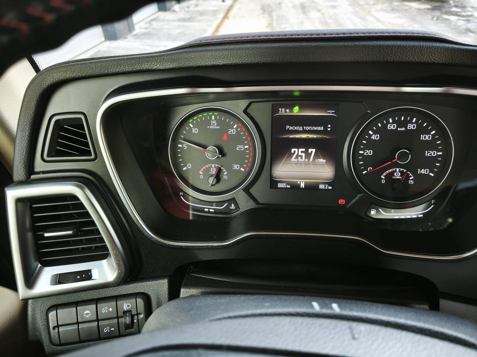 Приборная панель комбинированная: спидометр и тахометр — аналоговые, между ними небольшой цветной экран, на который бортовой компьютер выводит полезную информацию, в том числе мгновенный расход топлива — это помогает приноровиться к экономичному стилю вождения.