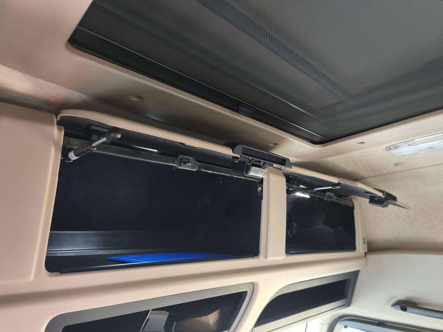 С боков кабины инженеры JAC предусмотрели ящики для инструментов и личных вещей. Причем с левой стороны таких ящиков два. Первый можно открыть клавишей, расположенной между ступенями. Замок второго рундука, как и расположенного напротив с правой стороны, активируется кнопками около сидений. Примечательно, что доступ к вещевым нишам есть прямо из кабины, за это отдельное спасибо.