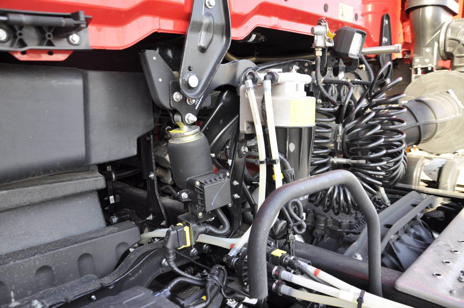 Механизм опрокидывания кабины тестируемого тягача электрический. Удобство бесспорное, но и ответственность: в сильные морозы нельзя допускать разряда аккумуляторной батареи, иначе придется управлять гидравлическим насосом вручную. Подвеска кабины JAC К7 пневматическая, 4-точечная, создающая сидящему за рулем максимальный ездовой комфорт.