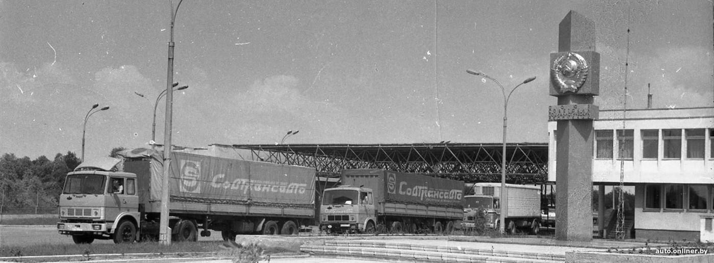 Однако Советский Союз много чего импортировал и много чего продавал за границу. Объемы постоянно росли. К началу 1980-х годов парк «Совтрансавто» насчитывал уже 2000 грузовиков, были открыты отделения в Брянске, Минводах, Ростове-на-Дону, Кишиневе, Ворошиловграде, Минске и Бресте. На следующем фото как раз-таки брестские МАЗы покидают Советский Союз через белорусско-польскую границу и отправляются на Запад.