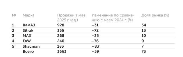 Так, ведущий производитель грузовиков КамАЗ по итогам мая сумел увеличить свою долю в продажах HCV до 34% (для сравнения: в мае 2024 года она составляла 19%), продав 928 машин. Снижение продаж этих грузовиков у КамАЗа в мае по сравнению с аналогичным периодом прошлого года было вдвое меньше среднерыночного — 31% против 65% в среднем по рынку. На втором месте идет китайский Sitrak. В прошлом году спрос на модели этой марки лишь на 40% уступал показателям КамАЗа, сейчас же он меньше почти втрое. На третьей позиции белорусский МАЗ, тоже с сокращением продаж меньше среднерыночного — на 35% (268 единиц, доля рынка — 10%). Топ-5 рейтинга тяжелых грузовиков замыкает китайский Shacman с болезненным падением на 83% (до 183 единиц) и долей рынка в 7% (см. таблицу).