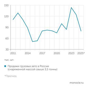 Текущая отрицательная динамика на рынке грузовиков во многом следствие взлета в прошлом и позапрошлом годах: в 2023-м реализация грузовых машин в РФ не просто показала выдающийся рост, а достигла исторического максимума со времен СССР. По данным «Автостата», тогда в стране было продано 143 тыс. грузовиков — на 70% больше, чем в 2022 году. В 2024-м рынок съехал вниз на незначительные 4%, до 124 тыс., но с начала текущего года падение серьезно усилилось.