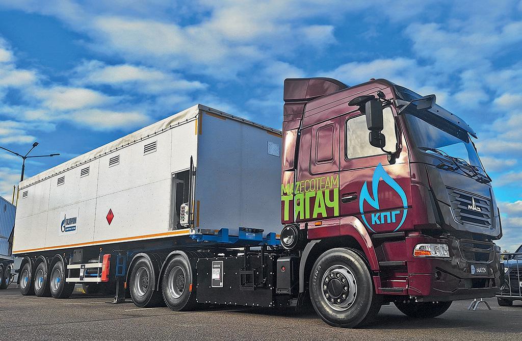 В конструкцию разработанного Минским автозаводом трехосного газового седельного тягача внедрен ряд свежих технических решений. Среди них — газовый двигатель увеличенной максимальной мощностью 420 л. с., прежде редко применяемая на МАЗах роботизированная 12‑ступенчатая коробка передач, а также спецкомплектация для перевозки опасных грузов, из-за чего, в частности, тягач оборудовали трансмиссионным тормозом — ретардером. Запас хода на запасенных в двух баках 900 л компримированного газа составляет порядка 450 км. Для самосвального автопоезда этого вполне достаточно, а вот для магистрального все же маловато. Но пробег на одной заправке может быть увеличен за счет размещения дополнительных баков за кабиной.
