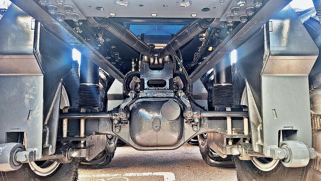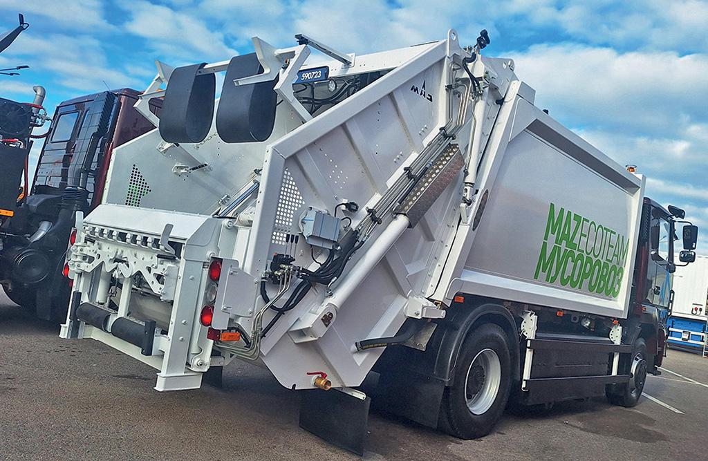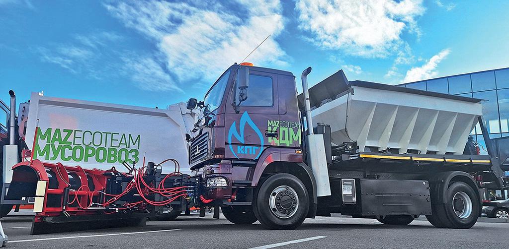 Минский автозавод привез на форум сразу два перспективных двухосных шасси МАЗ-534023 с двигателями, работающими на компримированном природном газе. Обычно такие шасси комплектуют коммунальными кузовами, и данный случай не стал исключением. Один МАЗ из этого дуэта оборудовали мусоровозным кузовом емкостью 16 кубов производства «Могилевтрансмаш». Второй предстал перед посетителями форума в варианте комбинированной дорожно-уборочной машины с выполненными из композитов 8‑кубовым бункером и отвалом с трехметровой шириной захвата, производства российской компании «Смолмаш». Оба шасси оснащены газовым двигателем известного производителя из дружественной страны рабочим объемом 7 л и мощностью 280 л. с. Суммарный объем газовых баллонов составляет без малого 900 л. Этого хватает примерно на 370 км.