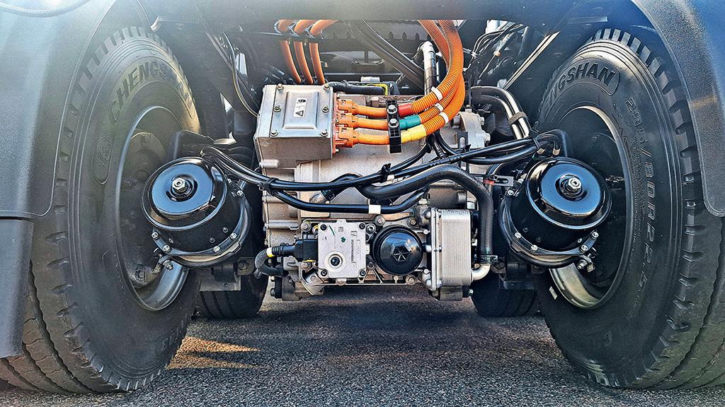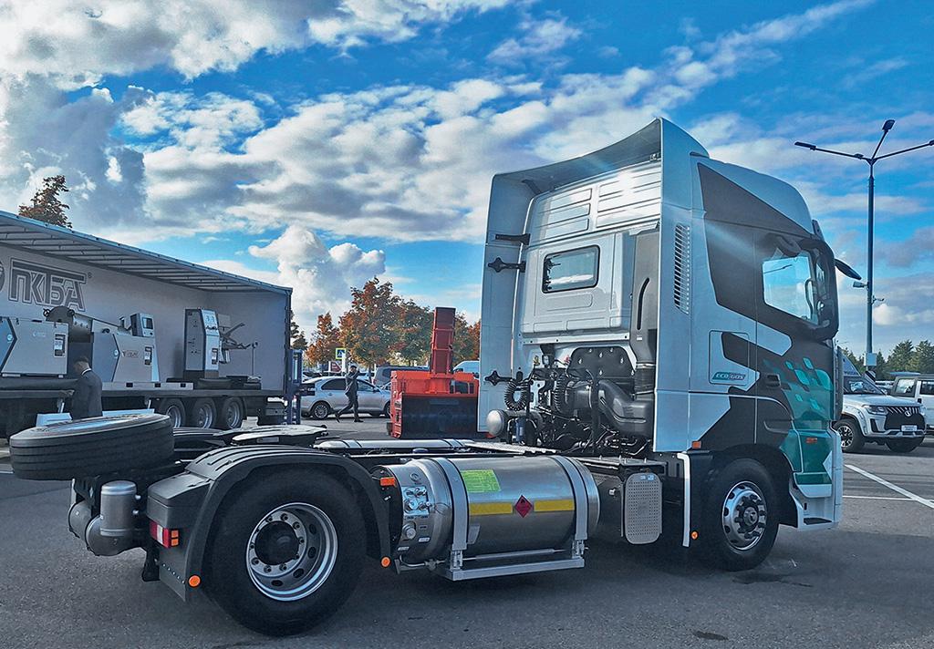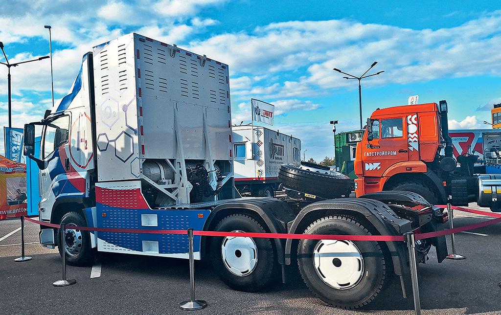 Существует ли еще какая-то газовая альтернатива сжатому или сжиженному метану? Да, она есть. Добытый метан можно превратить в водород, а тягач оборудовать системой топливных элементов, которая вырабатывает электричество за счет реакции между водородом и полученным из воздуха кислородом. Естественно, в данном случае вместо двигателя внутреннего сгорания такой тягач оборудован электродвигателем. Получается, что это элеткротрак, но без дорогущих аккумуляторных батарей. Точнее, они имеются, но в гораздо меньшем количестве. Вот такой седельный тягач на топливных элементах и продемонстрировала на форуме компания «АМТ». Он трехосный, и к каждому из двух задних ведущих мостов вместо кардана пристыкован электродвигатель номинальной мощностью 189 кВт и пиковой мощностью 265 кВт. Если суммировать мощность обоих электродвигателей и перевести ее значение в более привычные нам лошадиные силы, то получается, что в номинальном режиме это будет 514 л. с., а на максимуме — 720 л. с. Сдается, что с работой в составе обычного по полной массе автопоезда такой тягач справился бы и с одним электромотором.