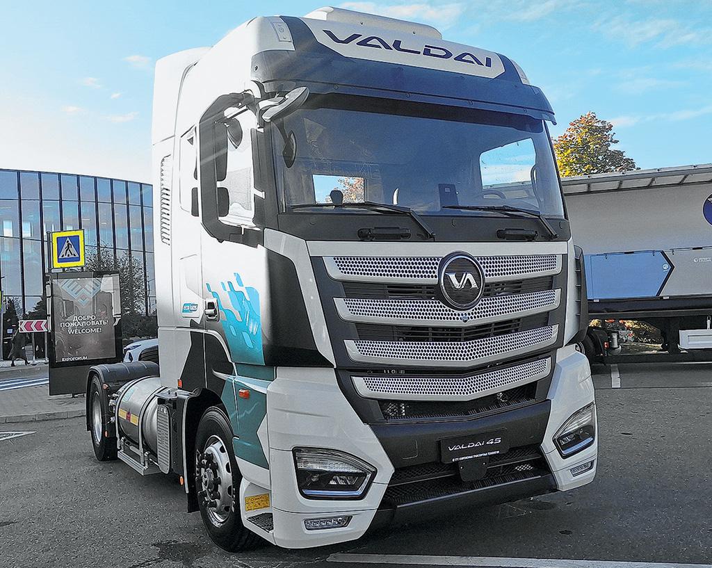Седельные тягачи «Валдай 45» с дизельным двигателем в Нижнем Новгороде начали собирать во второй половине 2023 года, постепенно наращивая локализацию производства. А теперь российским перевозчикам показали «Валдай 45 LNG» — опытную модификацию упомянутого тягача в газовом исполнении. Ее оснастили работающим на метане импортным рядным 6‑цилиндровым двигателем рабочим объемом 14,8 л с впечатляющей максимальной мощностью 570 л. с. С ним агрегатирована роботизированная 12‑ступенчатая коробка передач. Метан хранится в двух расположенных по бокам рамы криобаках общей вместимостью 950 л. Причем в сжиженном виде, поэтому его запаса хватит на вполне приемлемый для междугородных перевозок пробег 1200 км. В перспективе «Валдай 45» получит отечественный дизель ЯМЗ-770. Следом в серию запустят и его газовую модификацию, которую также планируют ставить в моторный отсек этого тягача.