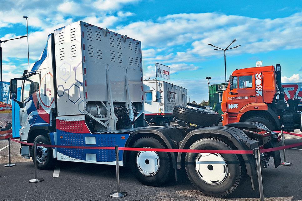 Существует ли еще какая-то газовая альтернатива сжатому или сжиженному метану? Да, она есть. Добытый метан можно превратить в водород, а тягач оборудовать системой топливных элементов, которая вырабатывает электричество за счет реакции между водородом и полученным из воздуха кислородом. Естественно, в данном случае вместо двигателя внутреннего сгорания такой тягач оборудован электродвигателем. Получается, что это элеткротрак, но без дорогущих аккумуляторных батарей. Точнее, они имеются, но в гораздо меньшем количестве. Вот такой седельный тягач на топливных элементах и продемонстрировала на форуме компания «АМТ». Он трехосный, и к каждому из двух задних ведущих мостов вместо кардана пристыкован электродвигатель номинальной мощностью 189 кВт и пиковой мощностью 265 кВт. Если суммировать мощность обоих электродвигателей и перевести ее значение в более привычные нам лошадиные силы, то получается, что в номинальном режиме это будет 514 л. с., а на максимуме — 720 л. с. Сдается, что с работой в составе обычного по полной массе автопоезда такой тягач справился бы и с одним электромотором.