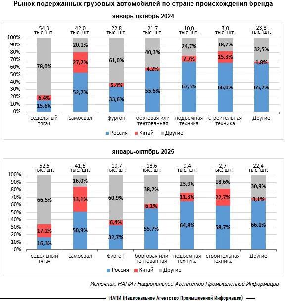За 10 месяцев 2025 года на вторичном рынке было реализовано 166 800 грузовых автомобилей, что на 5,7% меньше чем в прошлом году, когда продажи составили 176 900 штук. Ключевая динамика отмечается в структуре распределения брендов. Продажи подержанной российской техники упали на 7,1%, составив 69 тысяч экземпляров. Напротив, сегмент подержанных китайских грузовиков демонстрирует рост на впечатляющие 47,6%, достигнув отметки в 27,6 тысяч единиц.
