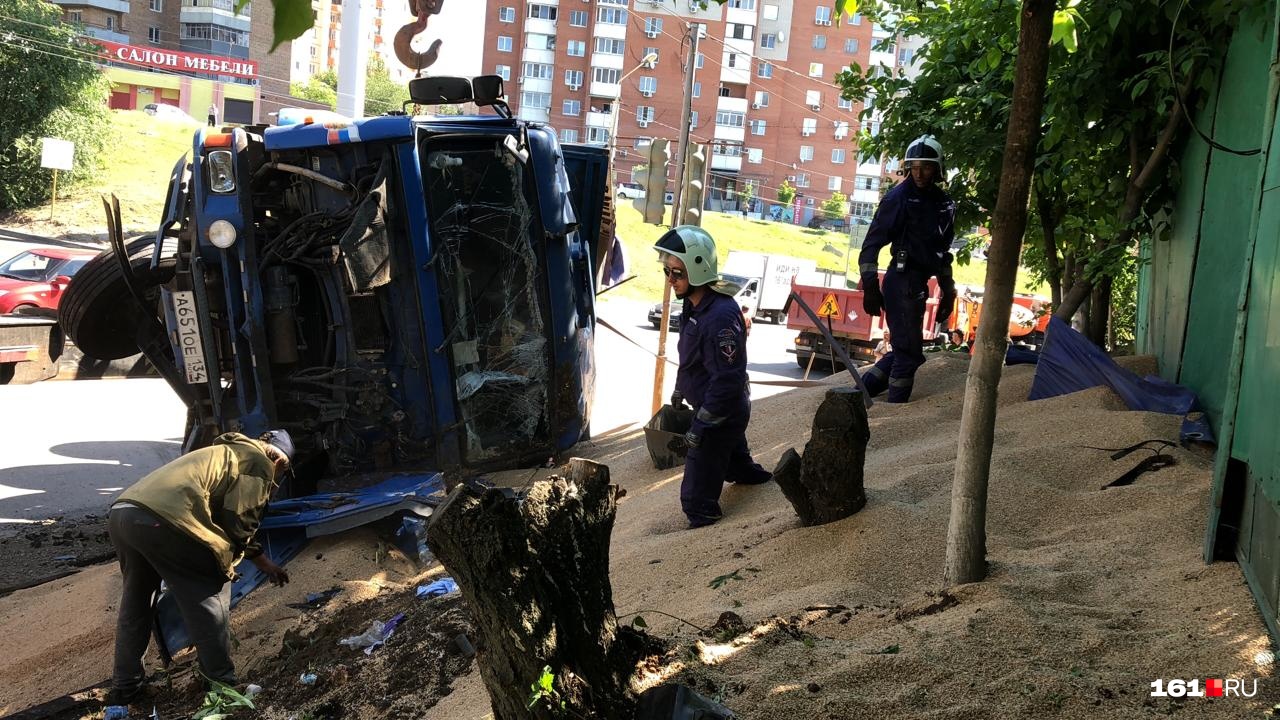 В Ростове этой ночью перевернулась фура с зерном. Как DONTR. RU, рассказали в областном ГИБДД, авария произошла в районе 3-х часов ночи на пересечении улиц Беляева и Королева. По предварительным данным, водитель большегруза не справился с управлением.