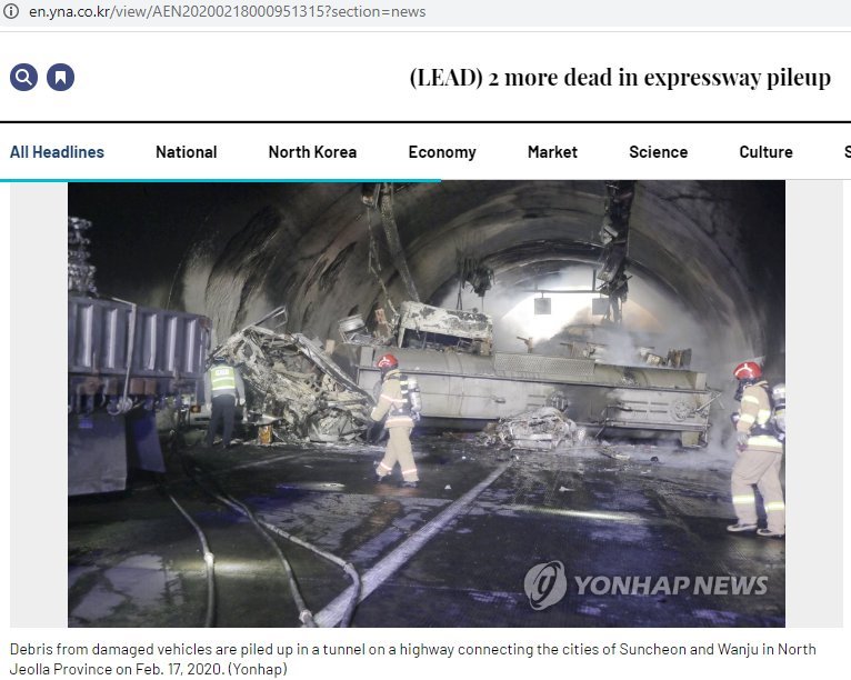 Страшное ДТП, развивавшееся поэтапно, зафиксировала камера наружного наблюдения при въезде в тоннель на скоростной автомагистрали на юго-западе Южной Кореи. Хотя оно произошло накануне, сегодня на месте аварии работы продолжаются, находят новых погибших.