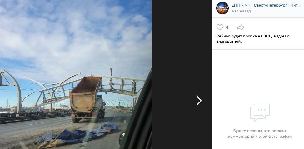 Самосвал ехал с поднятым кузовом и задел щит с указателями над трассой. Опора оказалась сильно повреждена, а движение по ЗСД на этом участке буквально остановилось. Три полосы трассы перекрыты по направлению с юга на север, открыта лишь крайняя левая полоса.