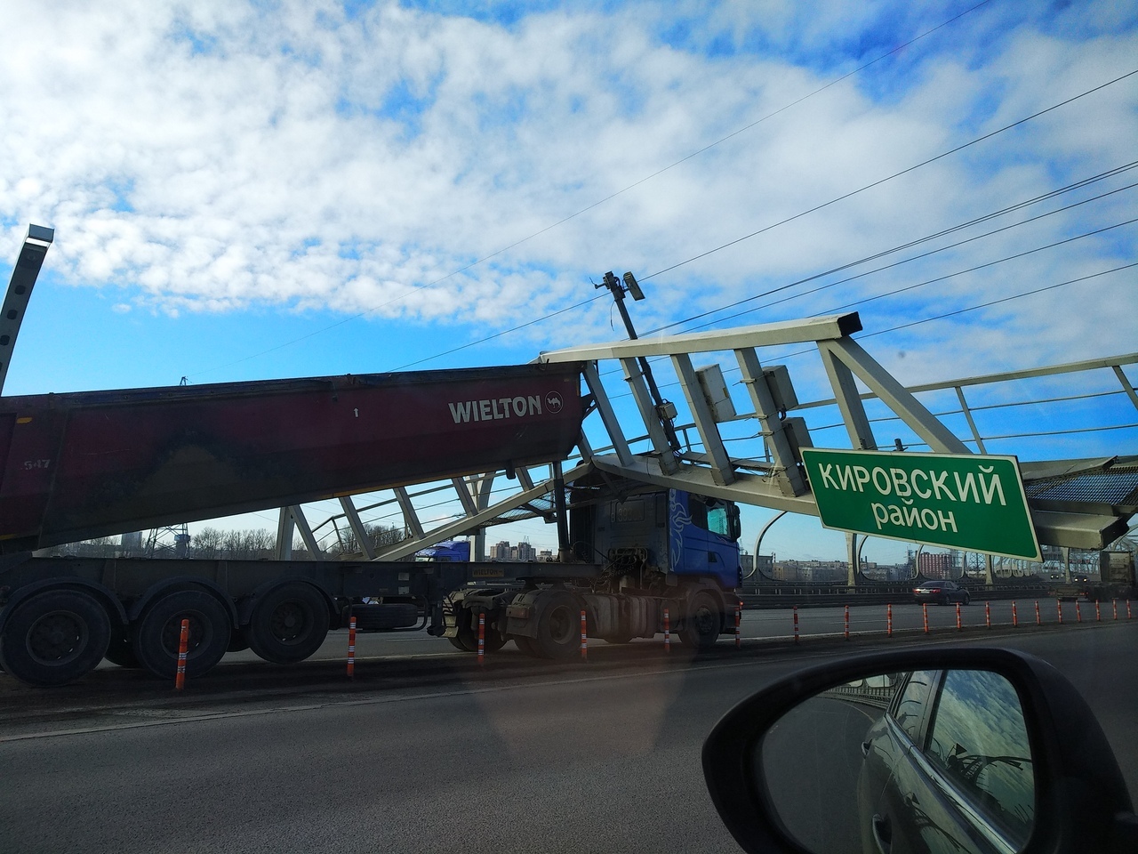 Большегруз ехал по Западному скоростному диаметру (ЗСД) с поднятым кузовом. Самосвал «остановил» первый встречный щит с указателями.