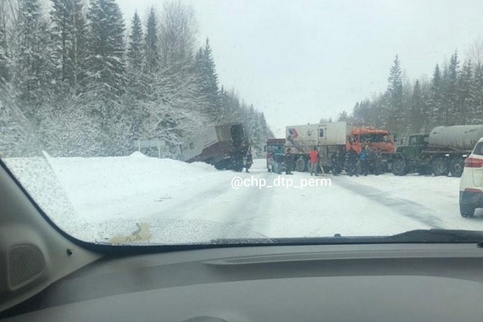 В социальных сетях сообщили о том, что на трассе Пермь-Добрянка столкнулись фура и бензовоз. Большегрузы перекрыли обе полосы дороги, оставив для проезда небольшую щель.