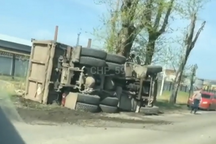 Авария случилась в районе дома 285 по улице Соликамская. 39-летний водитель самосвала МАЗ не справился с управлением на железнодорожном переезде. Многотонная машина опрокинулась и врезалась в дерево.