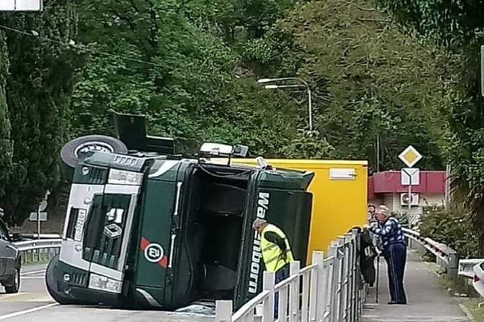 Накануне вечером на участке федеральнои трассы Джубга-Сочи, в Лазаревском раи оне Сочи опрокинулась фура марки «Рено».