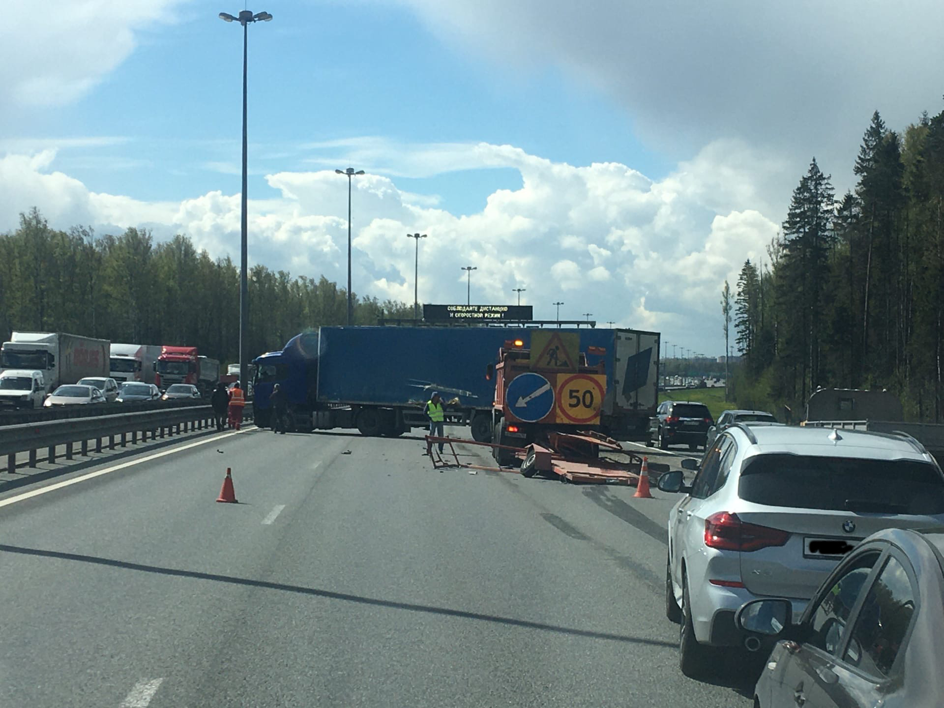 Фура разбила машину дорожников и встала поперек КАД в Петербурге. Собирается многокилометровая пробка