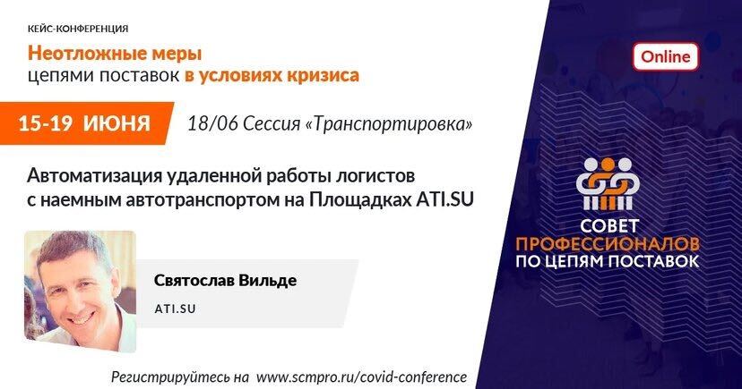 Основатель и директор биржи грузоперевозок ATI.SU Святослав Вильде выступит на первой антикризисной онлайн кейс-конференции Совета профессионалов по цепям поставок «Неотложные меры в управлении цепями поставок». Он расскажет об автоматизации удалённой работы логистов с наемным транспортом с помощью сервиса «Площадки».