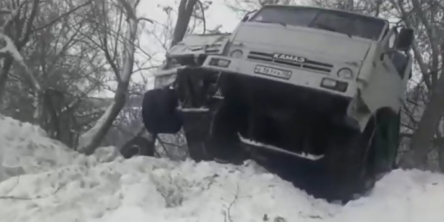 ДТП случилось примерно в 11.00 на горе в сторону поселка АЦИ. По предварительным данным, на повороте водитель «КамАЗа» не справился с управлением, зацепил ГАЗель-маршрутку и вылетел на обочину, застряв на краю оврага.