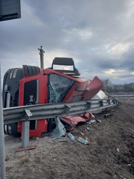 На фото с места происшествия видно, что грузовик лег на левый бок. Его кабина смята ограждением, а лобовое стекло разбито.