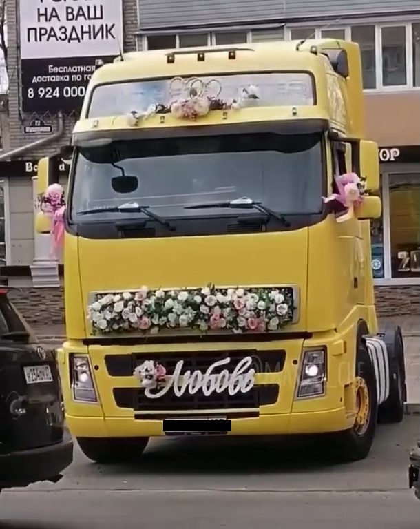 Очевидцы запечатлели у уссурийского ЗАГСа украшенный к свадьбе жёлтый большегруз, сообщает РИА VladNews со ссылкой на mark2_che.